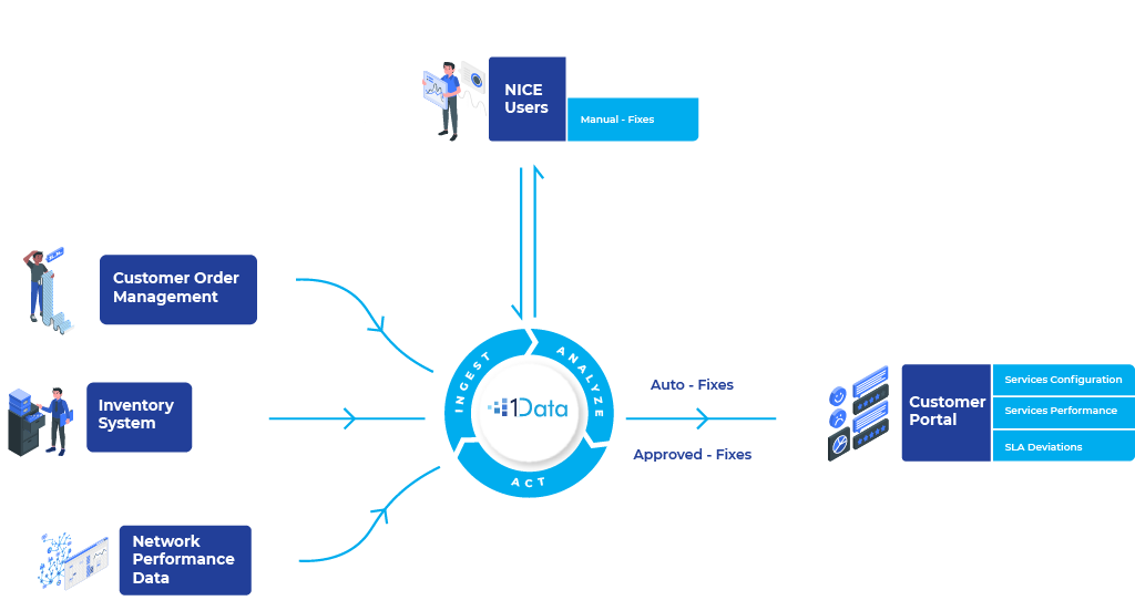 - The enterprise web portal was enabled to show changes in customer services within an hour of network events (activation, deactivation, faults, etc.) vs. days/weeks prior to 1Data deployment